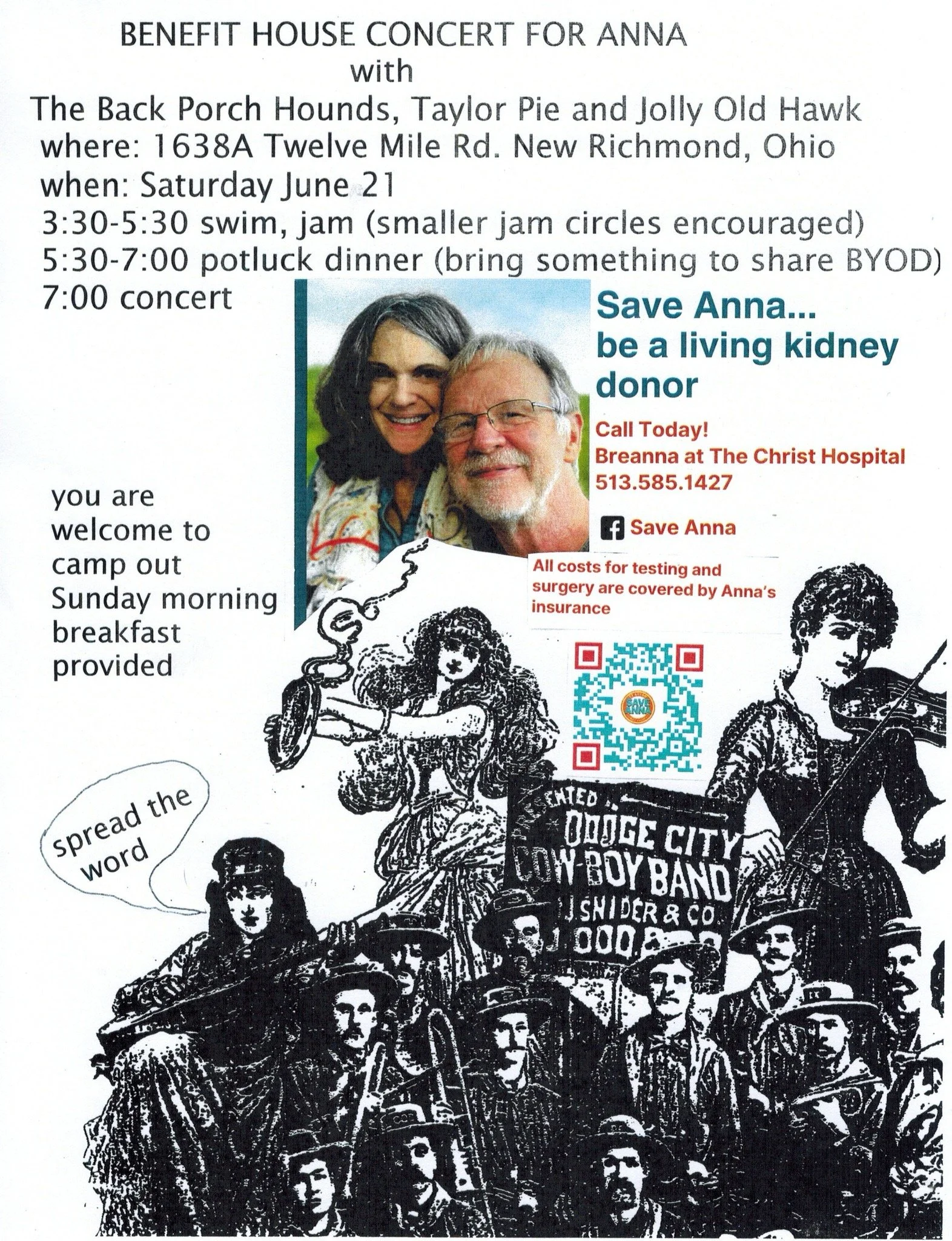 Benefit House Concert for Anna, at Mike Boerschig’s House, Saturday, June 21, 2025, 3:30 PM-10:00 PM(?). Everyone is invited.